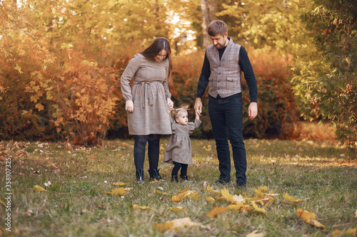 Family in a autumn park. Woman in a brown dress. Cute little girl with parents