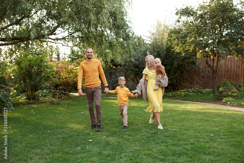family in nature, summer or autumn, green grass trees in green leaves, a pond in nature, mom blonde in a yellow dress, dad, husband, older son and youngest son, two children, a large and happy family
