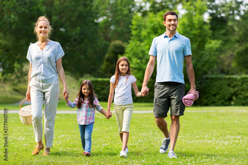 family, leisure and people concept - happy mother with picnic basket, father and two daughters walking in summer park