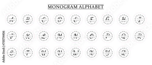 Family Monogram Letter A-Z, Set of Split Alphabet for Monogram. Monogram Alphabet. Vector Illustration for Wedding Invitation. Set of Initials with Decorative Plant Frame and Text Space