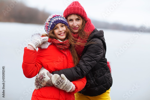 Family Mother and her daughter on a walk in winter. Active winter holydays concept. he joy of missing out.