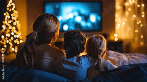 family, motion picture, night, watching, television, television, children, togetherness, home, living, room, entertainment, relaxing, cosy, comfort, joy, laughter, fun, together, bond, love, affection, sibling, mother, son, daughter, children, bed, bedding, blanket, couch, sofa, christmas, light, festive, holiday, warm, decor, indoor, indoor, warmth