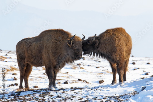 bison, winter, park, nature, animal, wild, wildlife, mammal, buffalo, snow, american, european, cold, white, large, bull, forest, brown, power, fur, horn, hair, group, head, field, meadow, evening, frost, fauna, endangered, herd, cow, time, altai, siberia, tenderness, relation, female, male