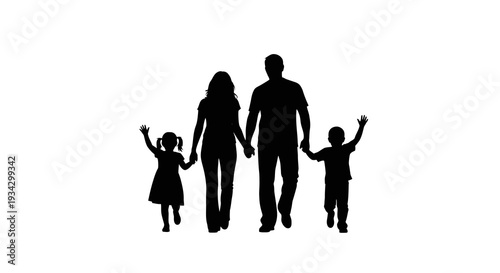 Family of four silhouetted against a plain background, holding hands and walking together in a joyful scene