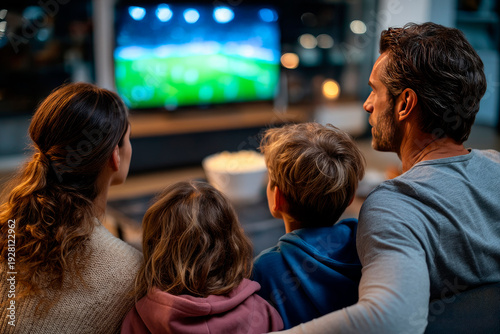 family, soccer, football, championship, match, home, watching, cheering, celebration, goal, living room, television, television, couch, children, mother, father, daughter, son, together, excitement, happiness, emotion, lifestyle, indoor, evening, snack, popcorn, fan, support, game, tournament, sport, victory, energy, oneness, modern, cosy, entertainment, leisure, bonding, event, international, audience
