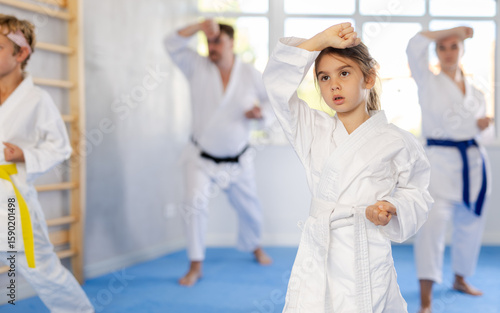 adult, woman, female, man, male, family, girl, boy, father, mother, son, daughter, brother, sister, husband, wife, caucasian, american, club, lifestyle, leisure, indoor, exercising, physical exercise, studio, gym, sport, class, practice, power, strong, karate, martial, art, kimono, karateka, fighter, taekwondo, defense, fight, judo, kata, punch, block