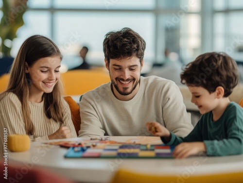 Family of travelers playing board games in an airport lounge, vibrant furniture, relaxed atmosphere, warm lighting, [family travel], [restful lounge experience]