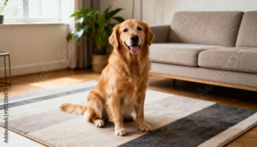 dog, pet, living room, home, interior, puppy, canino, animal, friendly, family, sofa, carpet, rug, sunlight, window, apartment, modern, cosy, cute, portrait, sitting, indoor, happy, loyal, mammal, fur, domestic, house, decor, plant, monstera, furniture, table, clean, minimal, contemporary, training, companion, purebred, pedigree, smile, paw, relaxing, lifestyle