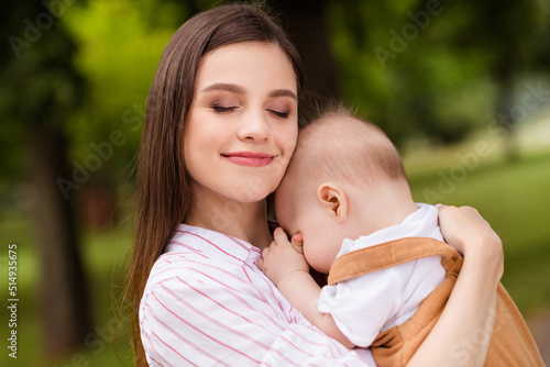 Family portrait of loving attractive mom cuddle dream sleeping son infant outdoors wearing casual clothes