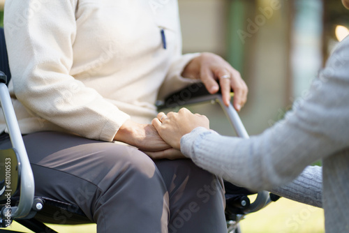 Family relationship Asian senior woman in wheelchair with happy daughter holding caregiver for a hand while spending time together