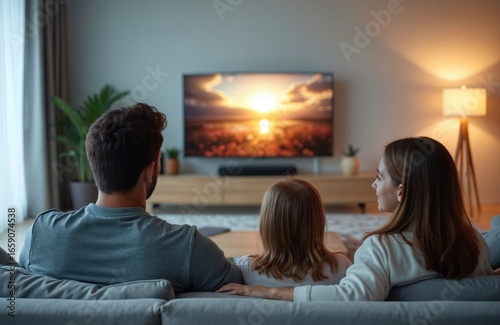 Family relaxing in living room watching television together. Parents and child enjoy movie night on sofa, cozy atmosphere, warm lighting. Seamless streaming entertainment for home media consumption.