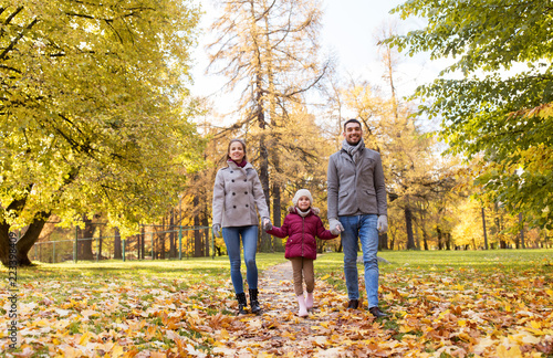 family, season and people concept - happy mother, father and little daughter walking at autumn park