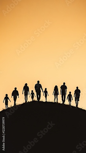 family, sunset, silhouette, hill, walking, group, children, adult, landscape, together, people, travel, journey, adventure, outdoors, nature, bonding, happiness, love, oneness, support, hope, dream, future, life, togetherness, connection, community, heritage, bequest, generation, peace, serenity, calm, freedom, relaxation, escape, horizon, sky, light, shadow, dusk, evening