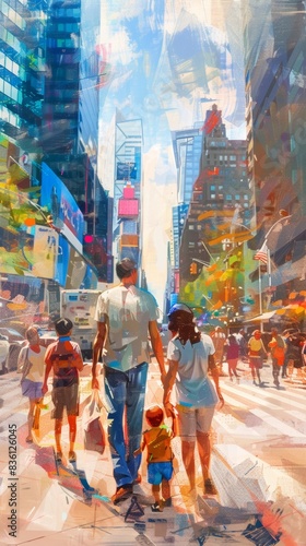 family, urban, city landscape, walking, illustration, colourful, street, vibrant, city, life, pedestrian, skyscraper, building, downtown, tied-up, lifestyle, travel, tour tourism, sunny, day, modern, art, digital, painting, architecture, metropolitan, crowd, summer, leisure, journey