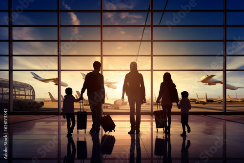 Family travel, showcasing silhouette figures of family members inside an airport terminal. AI Generated