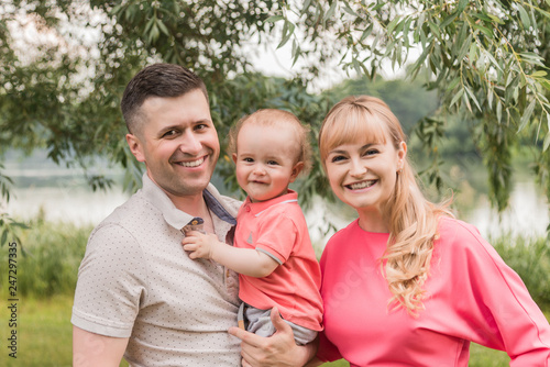 Family walk in the park. Family walks in the park. Man, woman and child in nature.