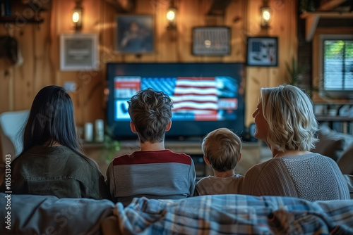 family, watching tv, american flag, patriotic, television, family time, living room, bonding, togetherness, evening, indoor, relaxation, cosy, backview, together, news, media, screen, sofa, sibling, entertainment, home interior, love, warmth, oneness, background, peaceful, connection, tradition, comforting, lifestyle