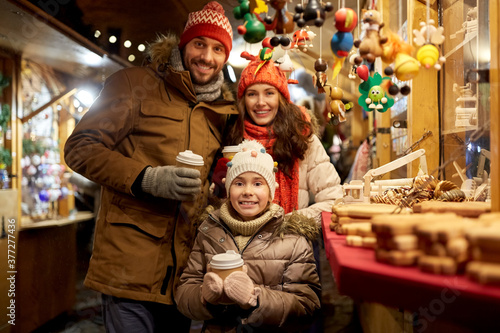 family, winter holidays and celebration concept - happy mother, father and little daughter with takeaway drinks at christmas market on town hall square in tallinn, estonia