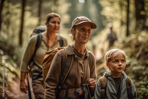 Family with small children and a dog hiking outdoors in summer nature, generative ai