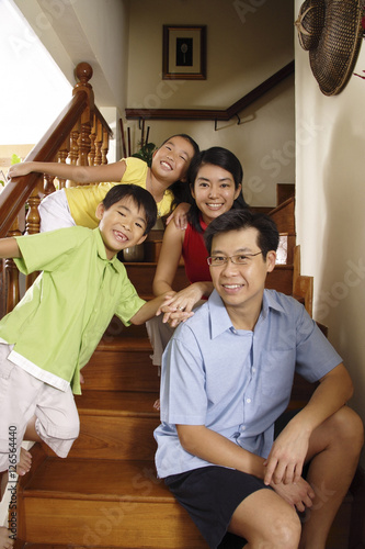 asia, asian ethnicity, home, barefoot beach, bermuda, black hair, boy, children, confidence, daughter, day, eyeglass, family, father, four people, girl, happy, holding, indoor, leaning, leisure, man, man, mother, many-coloured, portrait, railing, shirt, side by side, sitting, skirt, smiling, son, staircase, stair, standing, straight hair, t-shirt, togetherness, toothy smile, vertical, woman, woman, photo