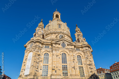 Famous Frauenkirche in the city center of Dresden, Germany in the morning sun with blue sky above.