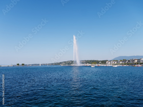 Famous Jet d'Eau fountain of the Geneva lake on a sunny day in Switzerland.