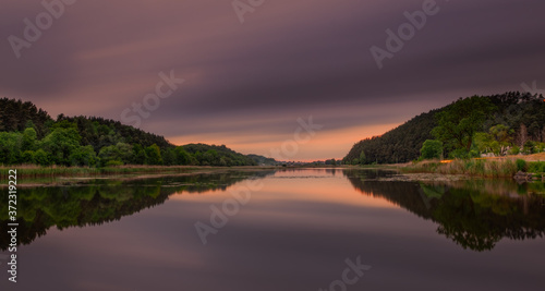 Fantastic beautiful sunset evening view on lake in Stradch, Lviv district. june 2020. Long exposure shot.
