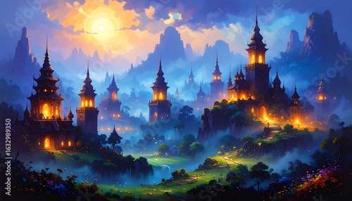 fantasy, city, landscape, sunset, mountain, vale, light, fog, tower, castle, building, tree, grass, colours, art, digital, illustration, beautiful, vibrant, peaceful, scenic, dreamlike, illuminated, mediaeval, asian, intricate, design, horizon, cloud, sun, nature, romantic, evening, glowing, path, stream, texture, detail, colours, gradient, smooth, style, fantasyland, charming, magical, lush, enchanting, gold