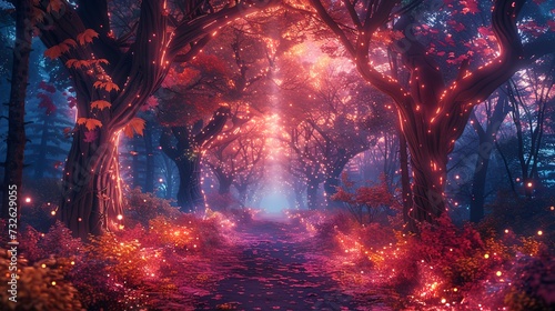 Fantasy forest path lined with glowing, magical autumn trees, a mystical journey through an enchanted fall landscape