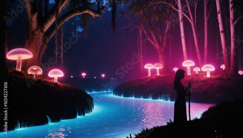 Fantasy forest with glowing mushrooms and a mystical river at night