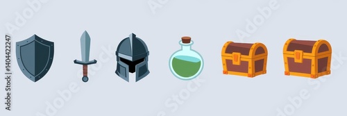 shield, sword, helmet, potion, treasure, chest, game, asset, fantasy, mediaeval, knight, warrior, battle, combat, defense, attack, weapon, armoring, magic, elixir, gold, wealth, rich, adventure, quest, icon, graphic, design, illustration, cartoon, vector, gameplay, gaming, digital, art, pixel, stylised, element, vintage, classic
