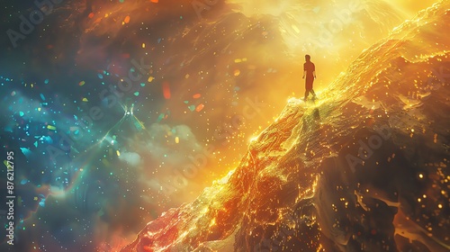 fantasy, landscape, lone, adventurer, racked, glow, surround, vibrant, cosmic, silhouette, ray, blue, abstract, peace, mountain, beauty, colours, quest, walk, yellow, path, vision, ascend, awe, trail, bright, scenic, person, climb, huge, cloud, surreal, pink, mood, sense, nature, dreamlike, sun, figure, journey, hue, fill, peak