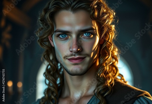 character, soft, piercing, structure, sharpened, long, subject, aesthetic, ambience, blue, human, eye, people, space, lit, clear, male, facial, dimly, hair, glow, warm, fantasy, smile, room, photorealistic, insertion, negative, slimmer, portrait, brown, image