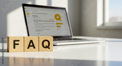 FAQ blocks in front of a laptop on a white surface indoors