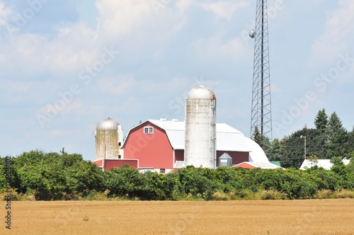 red, white, barn, shed, building, exterior, grey, roof, blue, sky, cloud, concrete, brown, silver, dome, steel, tree, bush, bush, green, farm, ranch, rural, scene, grove, outdoors, agriculture, horizontal, image, mobile phone, cellular, tower, antennae, satellite, dish, communication, dirt, field