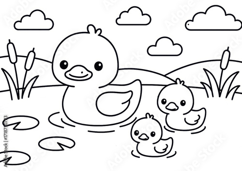 duck, duckling, farm, duck pond, water, swim, animal, cute, family, cartoon, children, fun, colouring, outline, grass, cattail, field, happy, adorable, learning, activity, meadow, children, printable, education, friendly, calm, pasture, simple, drawing, creative, illustration, farmyard, farm animal, nature