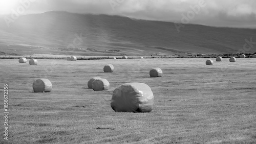 Farm hay bales in Icelandic countryside during bright summer day with scenic hills