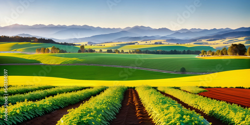 farm in farmland with a field of flowers and mountains in the background, with rolling hills and immaculate rows of crops