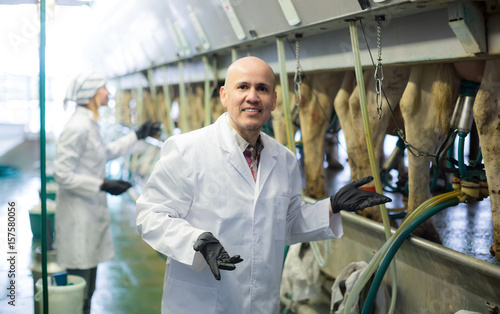 farm, operating, milking, machine, barn, people, man, woman, hired, girl, male, mature, senior, young, adult, cowgirl, smiling, casual attire, clothing, female, milkmaid, portrait, cow, farmer, caucasian, latina, american, european, job, heavy, work, well-being, professional, happy, equipment, agriculture, farming, village, peasant, industry, summer, province, dairy, herd, cattle, working man, farm animal, country