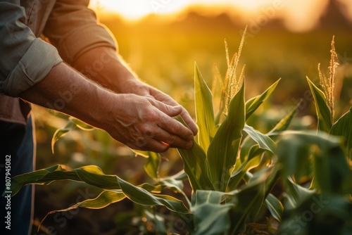 Farmer agronomist standing in green field, holding corn leaf in hands and analyzing maize crop. Agriculture, organic gardening, planting or ecology concept. High quality photo