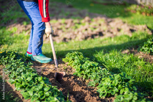 Farmer cultivating land in the garden with hand tools. Soil loosening. Gardening concept. Agricultural work on the plantation