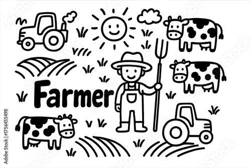 Farmer Doodle Scene. Doodle farmer with tractors, cows, and fields, center word “Farmer” in black and white isolated transparent