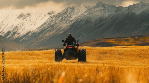 tractor, farmer, field, harvest, gold, mountain, landscape, rural, agriculture, farming, sunlit, scenic, huge, serene, peaceful, majestic, breathtaking, autumn, yellow, countryside, wilderness, nature, vehicle, machinery, driving, distant, highland, horizon