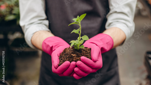 Farmer hand holding a fresh young plant. Symbol of new life and environmental conservation.
