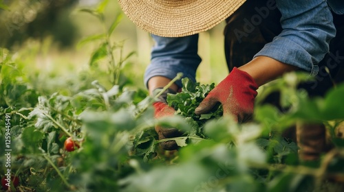 Farmer harvesting crops in a field. Wearing a straw hat and gloves. Highlighting agricultural practices and sustainability. Ideal for agricultural reports.