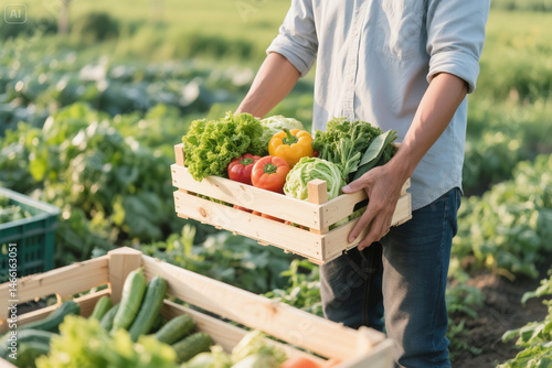 farmer, harvesting, vegetable, fresh, produce, crate, wooden crate, holding, carrying, field, farm, agriculture, lettuce, tomatoes, cabbage, organic, local, homegrown, healthy, food, crop, outdoors, sunny, daylight, rural, countryside, man, adult, torso, hand, working, labor, harvest, abundance, plentiful, ripe, natural, sustainable, cultivation, farming, market, garden, kitchen garden