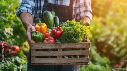 farmer holding wooden box full of fresh vegetables. harvesting season. basket with vegetables in the hands of a farmer background, healthy, organic, food, agriculture