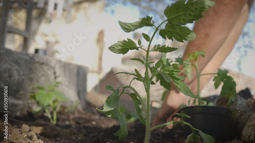 farmer is working of vegetable garden. Tomato seedling in first plan. Organic farmer, spring gardening, home farming. Ecology education