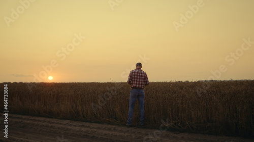 Farmer silhouette check grain quality at sunset country field. Thoughtful man