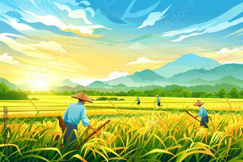 rice, paddy, farmer, field, landscape, agriculture, rural, harvest, green, nature, scenery, sunset, gold, sun, sky, cloud, mountain, hill, asia, farm, life, countryside, work, crop, farming, yellow, blue, hours, light, horizon, illustration, vector, art, digital, background, plant, harvesting, scene